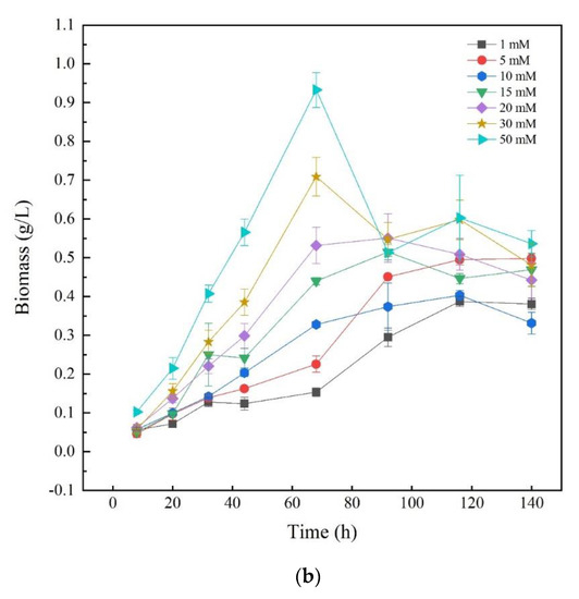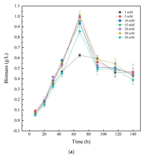 To investigate the effects of different nitrogen sources on the growth of Thraustochytriidae sp. PKU#Mn16, inorganic nitrogen source sodium nitrate (SN) and organic nitrogen source urea were chosen as the sole nitrogen source, respectively. Seven concentrations of N in the medium (1, 5, 10, 15, 20, 30, and 50 mM) were tested for Thraustochytriidae sp. PKU#Mn16 flask cultivations. As shown in Figure 1a, the growth trends of Thraustochytriidae sp. PKU#Mn16 were generally similar to each other for all the tested SN concentrations. Cell growth was relatively slow within the first 20 h, then entered the logarithmic phase with the time to peak biomass of 68 h, after which cell growth started to decline. At 68 h, the highest peak biomass (dry cell weight (DCW), 1.01 g/L) was observed in 30 mM SN cultivation, followed by 20 mM (1.00 g/L), 5 mM (0.99 g/L), 15 mM (0.95 g/L), 10 mM (0.93 g/L), 50 mM (0.86 g/L), and the lowest peak biomass occurred in 1 mM cultivation (0.63 g/L). Comparing to the sodium nitrate cultivation, the growth trends varied in different concentration of urea (Figure 1b). The highest peak biomass occurred at 68 h in cultivation (0.93 g/L) supplemented with 50 mM urea, followed by 30 mM (0.71 g/L). In cultivation with 15 mM and 20 mM urea, the time to peak biomass (at 0.44 g/L and 0.53 g/L) was 92 h, while in those with 5 mM and 10 mM urea the time to peak biomass (at 0.23 g/L and 0.33 g/L) was 116 h. The differential impact of SN and urea on biomass was also reported in previously published literatures as follows [20,30].