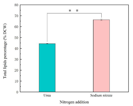 The total lipids content of Thraustochytriidae sp. PKU#Mn16 in 50 mM urea or 50 mM sodium nitrate cultivation. DCW represents dry cell weight. All tests were performed in biological triplicate. Values were means ± standard deviation. Statistically significant differences (p-value < 0.05 *) were tested by Student’s t-test, p * * <0.01.