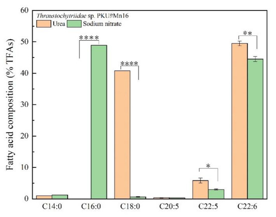 Fatty acid profile of Thraustochytriidae sp. PKU#Mn16 in 50 mM urea or 50 mM sodium nitrate cultivation. The name of fatty acids was shown in total carbon numbers: C14:0 = tetradecanoic acid (TDA), C16:0 = hexadecanoic acid (HDA), C18:0 = octadecanoic acid (ODA), C20:5 = eicosapentaenoic acid (EPA), C22:5 = docosapentaenoic acid (DPA), C22:6 = docosahexaenoic acid (DHA). All tests were performed in biological triplicate. Data were shown as weigh percentage of TFAs. Values were means ± standard deviation. Statistically significant differences (p-value < 0.5 *) were tested by Student’s t-test, p * <0.05, p **<0.01, p **** <0.0001.