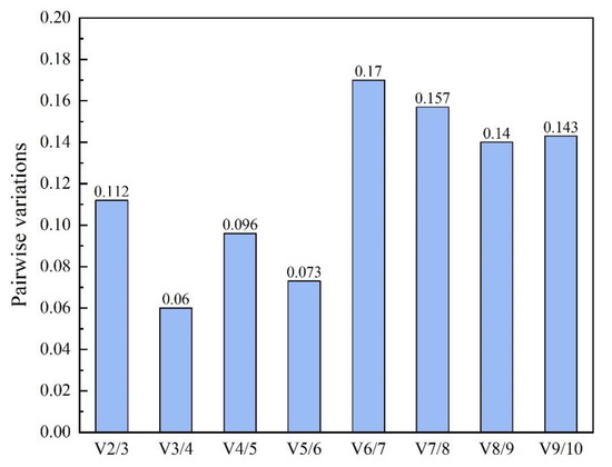 Determination of the optimal number of reference genes for normalization. Pairwise variation (V) of the candidate reference genes calculated by geNorm. To obtain reliable normalization, Vn/Vn + 1 should be smaller than a threshold of 0.15, otherwise, another reference gene (n + 1) should be added.