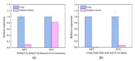In the nitrate assimilation pathway, nitrate reductase (NR) plays an important role and can be found in bacteria, microalgae, fungi and plants [51,54,55]. NR is a cytosolic enzyme that catalyzes the very first step in nitrogen assimilation, that is, to convert nitrate (NO3−) to nitrite (NO2−). The nitrite is then catalyzed by nitrite reductase to ammonium (NH4+) [56]. It has been demonstrated that the activities of NR are high in nitrate cultivated cells and low when ammonium used as a nitrogen source to cultivate cells [57]. Urea is an economical friendly organic nitrogen source. In the urea metabolism, urease, one of the extracellular enzymes of Thraustochytrids [58], catalyzes the conversion of urea to carbon dioxide and ammonia. Interestingly, in the present study the gene expression of NR was down-regulated in Thraustochytriidae sp. PKU#Mn16 under urea cultivation compared to that under sodium nitrate cultivation, which was consistent with NR activities. In the study of Benhima et al., sodium tungstate was used to inhibit NR in microalgae Dunaliella tertiolecta, resulting in a 50% increase of neutral lipids. Besides, fatty acid methyl esters composition showed a slight variation of polyunsaturation and elongation [59]. McCarthy et al. found that the knockout (KO) of NR gene impacted the lipids metabolism in model pennate diatom Phaeodactylum tricornutum. The concentration of triacylglycerol was increased in NR-KO cells, consistent with up-regulated key genes of triacylglycerol biosynthesis [56]. Consistent with published works, our results showed sodium nitrate induced a relatively high expression level of NR, and urea down-regulated NR expression resulting in more long chain PUFAs.