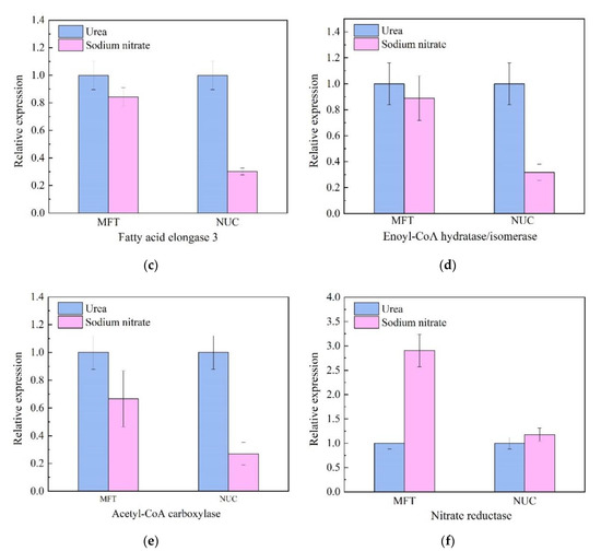 Six genes that play important roles in fatty acid biosynthesis and metabolism were chosen to explore the mechanism on how the different nitrogen source influence the production of the fatty acids. Similar expression profiles were obtained with using either MFT or NUC as a reference gene (Figure 5), which confirmed that the methods to quantify gene expression were reliable in the present study.
