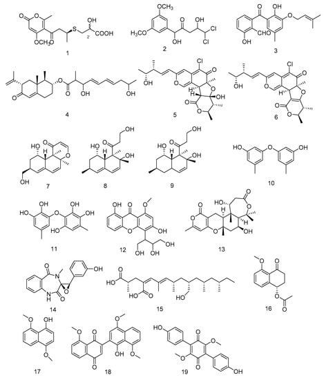 Compounds 1–4 (Figure 2) are all polyketides. New compounds 2-hydroxyl-3pyrenocine-thio propanoic acid (1) and 5, 5-dichloro-1-(3, 5dimethoxyphenyl)-1, 4-dihydroxypentan-2-one (2), containing sulfur or chlorine atoms, were isolated from the ethyl acetate extract of Penicillum citreonigrum. Compound 1 existed in the form of C-2′ epimers with a ratio of 1:2 (2′R:2′S). It showed potent cytotoxicity against human hepatocellular carcinoma cell (HCC) line Bel7402 and human fibrosarcoma cell line HT1080. The IC50 (50% inhibiting concentration) values were 7.63 ± 1.46 and 10.22 ± 1.32 µM, respectively. Compound 2 exhibited an IC50 value of 16.53 ± 1.67 µM against human fibrosarcoma tumor cell HT1080 []. Benzophenone derivatives tenellone H (3) and compound AA03390 (4) were isolated from the extract of a fungus Phomopsis lithocarpus derived from Indian Ocean sediments, compound 3 exhibited moderate cytotoxic activity against human HCC line and human non-small cell lung cancer cell (NSCLC) line A549, with IC50 values of 16.0 ± 0.1 and 17.6 ± 0.3 µM, respectively. Compound 4 showed weak cytotoxic activity against human HCC cell line HepG-2, human breast cancer cell line MCF-7, human neuronal cancer cell line SF-268 and human NSCLC line A549 [].