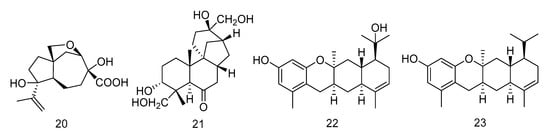 Penigrisacid D (20) is a sesquiterpene isolated from the extract of Penicillium griseofulvum, which showed a weak inhibitory activity against esophageal cancer cell line ECA-109, with an IC50 value of 28.7 µM []. Aphidicolin A8 (21) is a diterpene isolated from the extract of Botryotinia fuckeliana derived from Western Pacific seawater samples, which induced human bladder cancer cell T24 and human promyelocytic leukemia cell HL-60 apoptosis by DNA damage, with the IC50 values of 2.5 μM and 6.1 μM, respectively []. Photeroids A (22) and B (23) were isolated from the extract of the fungus Phomopsis tersa. They are both heteroterpenes containing a 6/6/6/6 tetracyclic system which forms Ortho-Quinone methides (o-QMs) intermediates through a rare Diels-Alder reaction. Compounds 22 and 23 (Figure 3) showed moderate cytotoxicity against four human cancer cell lines: SF-268, MCF-7, HepG-2 and A549 [].
