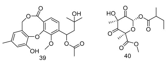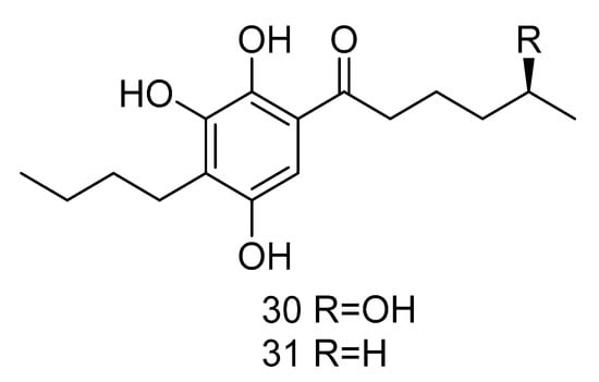 Sarcopodinols A (30) and B (31) (Figure 5) were isolated from the fungus Sarcopodium sp. FKJ-0025 isolated from coastal sediments of Kagoshima. Compound 30 had weak cytotoxity towards human T-lymphocytic leukemia Jurkat cell line, with the IC50 value of 47 μg/mL. Compound 31 exhibited an IC50 value of 37 μg/mL against HL-60 cell line, 47 μg/mL against Jurkat cell line, and 66 μg/mL against human pancreatic cancer Panc1 cell [].