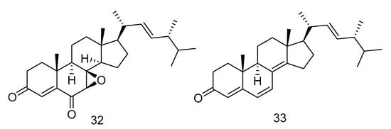 7β, 8β-epoxy-(22E, 24R)-24-methylcholesta-4, 22-diene-3, 6-dione (32) and ergosta-4, 6, 8(14), 22-tetraene-3-one (33) (Figure 6) were steroids isolated from the extract of Aspergillus penicillioides SD-311 from deep sea-sediment collected of the South China Sea. Compound 32 could inhibit Vibrio anguillarum with the MIC (minimum inhibitory concentration) value of 32.0 mg/mL. And compound 33 showed antibacterial activity against Edwardsiella tarda and Micrococcus luteus with MIC values both of 16 mg/mL [].
