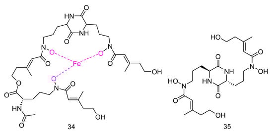 Mycosphazine A (34) was isolated from the extract of Mycosphaerella sp. SCSIO z059. It is a new a new iron(III) chelator of coprogen-type siderophore which could greatly promote the biofilm formation of Bacillus amyloliquefaciens with the rate of about 249% at concentration of 100 μg·mL−1. Its alkaline hydrolysate was a new epimer of dimerum acid, mycosphazine B (35) (Figure 7) which showed the same activity with the rate of about 524% at concentration of 100 μg·mL−1 [].