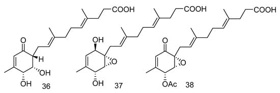 Peniginsengins C–E (36–38) (Figure 8) were new farnesylcyclohexenones isolated from the extract of Penicillium sp. YPGA11 from the sea water in the Yapu Trench. They showed activity against methicillin-resistant Staphylococcus aureus (Methicillin-resistant Staphylococcus aureus (MRSA), and anti-methicillin-sensitive Staphylococcus aureus (Methicillin-Sensitive Staphylococcus aureus, MSSA), with the MICvalues ranging from 8 μg/mL to 64 μg/mL [].