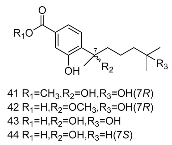 Four bisabolane-type sesquiterpenoid derivatives ent-aspergoterpenin C (41), 7-O-methylhydroxysydonic acid (42), hydroxysydonic acid (43) and sydonic acid (44) (Figure 10) were isolated from Aspergillus versicolor derived from the deep-sea sediment of South China Sea. Compounds 41–42 had strong antibacterial activity, whose MIC values against Escherichia coli, Edwardsiella tarda, Vibrio harveyi and Vibrio parahaemolyticus were all below or equal to 8.0 µg/mL. Moreover, compound 43 exihibited antibacterial activities against Aeromonas hydrophilia, Escherichia coli, Vibrio anguillarum and Vibrio harveyi, with the MIC value of 4.0 µg/mL, equal to the positive control Chloramphenicol [].