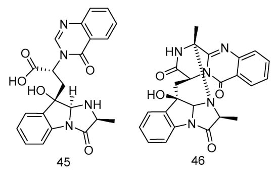 Fumigatosides E (45) and F (46) (Figure 11) were quinazoline-containing indole alkaloids, isolated from the extract of Aspergillus fumigatus from the deep-sea sediments of the Indian Ocean. Both of them showed potent antibacterial activities. The MIC values of compound 45 against Acinetobacter baumannii ATCC 19606, Acinetobacter baumannii ATCC 15122, Staphylococcus aureus ATCC 16339 and Klebsiella pneumoniae ATCC 14578 were: 12.5 ± 0.042, 6.25 ± 0.035, 6.25 ± 0.13, 12.5 ± 0.098 µg/mL, and the MIC value of compound 46 against Acinetobacter baumannii was 6.25 ± 0.033 µg/mL [].