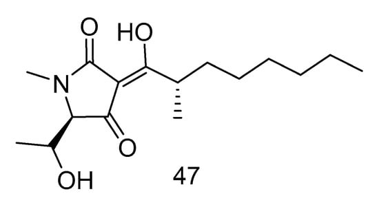 Penicillenol A2 (47) (Figure 12) was isolated from the extract of Penicillium biourgeianum isolated from the sediments of the South China Sea with an inhibitory effect on MSSA. The diameter of inhibitory zone (ZD) is 6.75 ± 0.25 mm. Besides, the synergy of compound 47 with penicillin G sodium (Pen), cefotaxime sodium (Ctx) and oxacillin sodium (Oxa) was studied by plate count and Kirby-Bordisk diffusion method. It was found that, in comparison with the control group, the reduction of bacteria in the experimental group using Pen (10 U mL−1), Ctx (15 U mL−1) and Oxa (1 U mL−1) was less than 1 log CFU/mL. Compared with using compound 30 alone, the reduction of viable bacteria in the experimental group using both the above drugs and compound 47 was greater than or equal to 2 log CFU/mL. Therefore, the combination of compound 30 and β-lactam antibiotics had a synergistic effect, which can increase the sensitivity of MRSA to β-lactam antibiotics [].