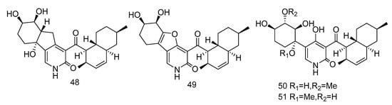 Pyridone alkaloids, apiosporamide (25) and arthpyrones F–K (48–51) (Figure 13), were isolated from the extract of Arthrinium sp. UJNMF0008 from the sediments of South China Sea, which showed moderate to strong antibacterial activity against Mycobacterium smegmatis and Staphylococcus aureus, with the IC50 values ranging from 1.66–42.8 µM [].