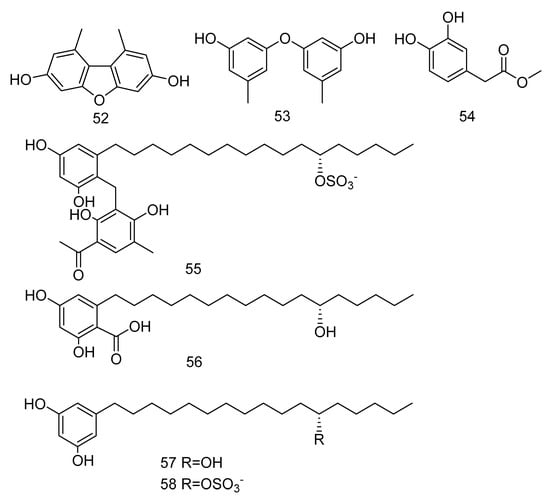 3, 5-dimethoxytoluene (52), 3, 3′-dihydroxy-5, 5′-dimethyldiphenyl ether (53), 3, 4-dihydroxyphenylacetic acid methyl ester (54) (Figure 14) were isolated from the extract of Aspergillus sp. SCSIO06786 from deep-sea sediments in the Indian Ocean. Compounds 52 and 53 with 50 μg/disc showed inhibition zones against S. aureus, MRSA and E. faecalis. Compound 54 with 50 μg/disc inhibited the growth of MRSA. In addition, their MIC was tested and the results showed that it was between 3.13–12.5 μg/mL []. Penixylarins B–C (55–56), 1, 3-dihydroxy-5-(12-hydroxyheptadecyl)benzene (57), and 1, 3dihydroxy-5-(12-sulfoxyheptadecyl)benzene (58) (Figure 14) were isolated from a mixed culture of the Antarctic deep-sea-derived fungus Penicillium crustosum PRB-2 with a fungus Xylaria sp. HDN13-249. Compounds 55–58 showed activities against Bacillus tuberculosis, B. subtilis or Vibrio parahaemolyticus, MIC values ranging from 6.25 to 100 μM. Among them, the MIC value of compound 56 against B. tuberculosis was 6.25 μM, showing the anti-tuberculosis potential [].