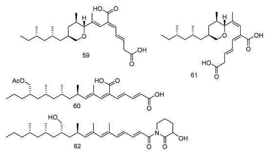 The tyrosine phosphatase (Mptp) secreted by Mycobacterium tuberculosis is an important virulence factor of Mycobacterium tuberculosis and recognized to be an important target to treat tuberculosis. Tyrosine phosphatase is secreted by Mycobacterium tuberculosis, which has two functional phosphatases, PTP A and B (MptpA and MptpB) and enters the cytoplasm of macrophages, preventing the activation of the host’s immune system and regulating the survival of the bacilli in the host []. Compounds 59–62 (Figure 15) were polyacrylate derivatives with long hydrophobic chains, isolated from the extract of Aspergillus fischeri derived from deep sea sediments in Indian Ocean. Compounds 59–62 inhibited M. tuberculosis protein tyrosine phosphatase B (MptpB) through non-competitive inhibition, with IC50 values of 5.1, 12, 4.0 and 11 μM, respectively [].