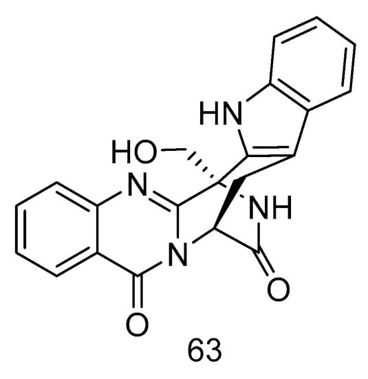 Quinazoline-containing indole alkaloid, fumigatoside F (63) (Figure 16), was isolated from the extract of Aspergillus fumigatus derived from deep-sea sediments of the Indian Ocean. The MIC values against Fusarium oxysporum f. sp. cucumerinu and Fusarium oxysporum f. sp. momordicae were 25 ± 0.04 and 1.565 ± 0.098 µg/mL, respectively [].