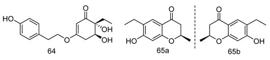 Trieffusols C (64) and D (65) (Figure 17) were isolated from the extract of Trichobotrys effuse from deep-sea sediments of the South China Sea with inhibition of nitric oxide (NO) production in murine macrophages. Their IC50 values were 51.9 and 55.9 μM, which is equivalent to the positive control aminoguanidine (IC50: 24.8 μM) [].