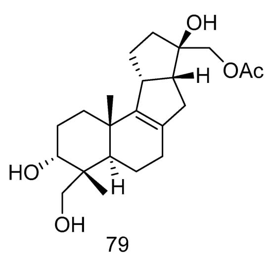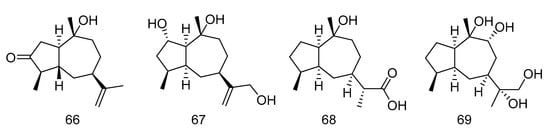 Graphostromane D (66), graphostromane F (67), graphostromane I (68) and (1R, 4S, 5S, 7S, 9R, 10S, 11R)-guaiane-9, 10, 11, 12-tetraol (69) (Figure 18) were sesquiterpenoids isolated from the extract of Graphostroma sp. MCCC 3A00421 derived from hydrothermal sulfide deposit. Compound 50 showed anti-infammatory activity against LPS-induced NO production in RAW264.7 macrophages, with an IC50 value of 14.2 μM, even stronger than that of positive contrast. Meanwhile compound 66, 68 and 69 exhibited weak anti-infammatory activities, with the IC50 values of 72.9, 79.1, and 88.2 μM [].