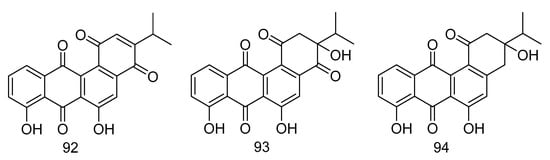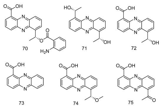 Phenazine derivatives, 6-[1-(2-aminobenzoyloxy)ethyl]-1-phenazinecarboxylic acid (70), saphenol (71), (R)-saphenic acid (72), phenazine-1-carboxylic acid (73), 6-(1-hydroxyehtyl)phenazine-1-carboxylic acid (74) and 6-acetyl-phenazine-1-carboxylic acid (75) (Figure 19), were isolated from the extract of Cystobasidium laryngis, which inhibits the NO in mouse macrophage RAW 264.7 cells induced by Lipopolysaccharide (LPS), and does not affect the viability of RAW 264.7 cells at a concentration of up to 30 µg/mL. Compounds 72, 74, 75 showed similar inhibitory effects, of which compound 74 had the most obvious inhibitory effect, with the concentration for 50% of maximal effect (EC50) value of 19.6 µM. Methylated compound 74 and oxidized compound 75 showed no significant differences in activity mentioned above, but their strength was twice as strong as compound 70 (EC50 = 46.8 µM) substituted with 2-aminobenzoic acid. In addition, when there is no functional group substitution at C-6 of phenazine (73, EC50 = 76.1 μM), the activity is the lowest [].
