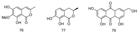 Polyketides 76–78(Figure 20) were isolated from Graphostroma sp. MCCC 3A00421 derived from hydrothermal sulfide, which showed antifood allergic activity. Reticulol (76) showed effective inhibition of immunoglobulin E-mediated rat basophilic leukemia-2H3 cells (RBL-2H3) degranulation, with an IC50 value of 13.5 µM, which was about seven times stronger than the commercially available anti-food allergy drug loratadine (IC50 = 91.6 µM), while 7, 8-dihydroxy -3-methyl-3, 4-dihydroisocoumarin (77) and hydroxyemodin (78) showed weaker effects, with IC50 values of 154.1 and 139.3 µM [].