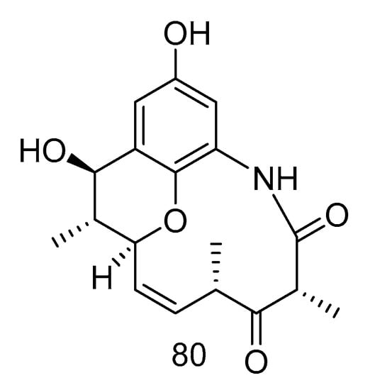Cebulactam A2 (80) (Figure 22) was a polyketide isolated from the extract of Saccharopolyspora cebuensis derived from Atlantic deep-sea sediments, which had a weak antiproliferative effect on human cervical cancer cell Hela and human lung cancer cell H1299, the inhibition rates (20.00 μg/mL) were 35.0 and 31.0%, respectively [].