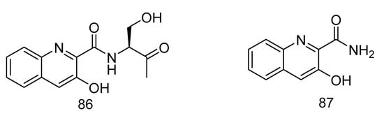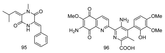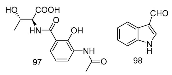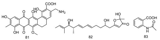 Akazamicin (81), actinofuranone C (82) and N-formylanthranilic acid (83) (Figure 23) were isolated from the extract of Nonomuraea sp. AKA32 derived from seawater of Sagami Bay in Japan. Compounds 81 and 82 showed the same level of cytotoxic activity against B16 melanoma cells, with IC50 values of 1.7 and 1.2 µM, respectively. Compound 83 showed about 10 times lower cytotoxic activity than that of compounds 81 and 82. The cytotoxic activity of these three compounds against human liver cancer cells Hep G2 and human colorectal adenocarcinoma cells Caco-2 was not obvious, with IC50 values ranging from 10 to 200 μM [].