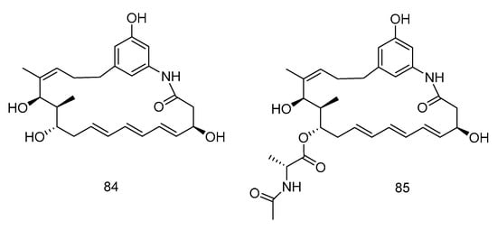 Trienomycins J–H (84–85) (Figure 24) were isolated from the extract of Ochrobactrum sp. OUCMDZ-2164 derived from deep-sea water of the South China Sea. Compound 84 exhibited antitumor activity against human breast cancer cells (MCF-7) with 61.5% inhibition rate at 10 μmol/L []. Compound 85 showed cytotoxic activity against human lung carcinoma cell line (A549) and human leukemia cell line (K562) with IC50 values of 15 and 23 µM, respectively [].