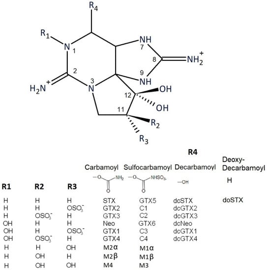 Paralytic shellfish toxins (PSTs) are harmful neurotoxins originating from phytoplankton of the genera Gymnodinium, Pyrodinium and Alexandrium that periodically accumulate in shellfish through filter feeding. These may result in sickness and even fatalities following human consumption of contaminated shellfish products [1,2]. The toxins are members of the saxitoxin family, which contain over 55 structurally related compounds [3] (Figure 1). Toxicity relates to the action of the toxins on voltage-gated sodium channels, leading to numbness, tingling sensations and nausea, with high doses causing paralysis and death by asphyxiation [4,5]. The hydrophilic saxitoxins consist of three different groups of compounds, as classified by their chemical structure: N-sulfocarbamoyl, decarbamoyl and the carbamoyl toxins [6]. Other hydrophobic congeners are also known to exist, most notably in bivalves exposed to Gymnodinium catenatum [7], including those from South America [8].