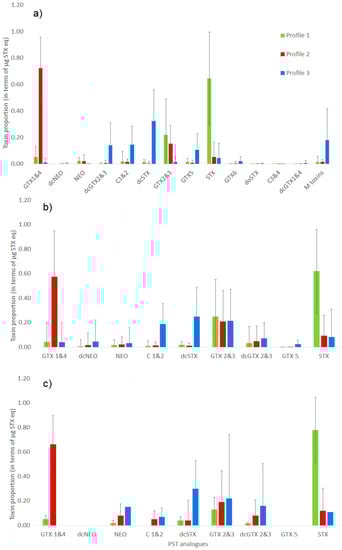 Summary of toxin profiles in terms of saxitoxin equivalents for each of the three profile clusters determined in LA shellfish samples following (a) LC-MS/MS analysis, (b) PreCOX LC-FLD and (c) PCOX LC-FLD.