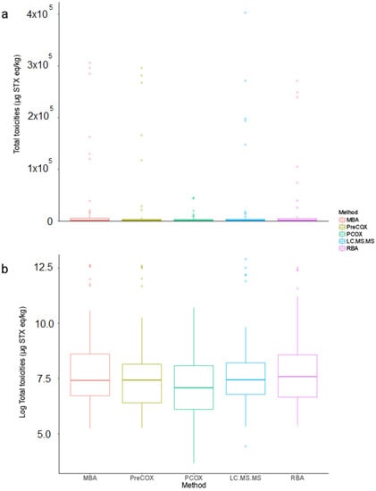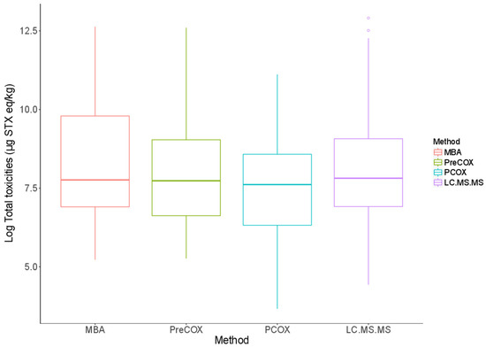 Across all quantitative data points, mean ratios between the total PST results obtained from each method in comparison with the PreCOX LC-FLD were 0.88 (PCOX), 1.34 (LC-MS/MS), 1.65 (RBA) and 3.91 (MBA). However, different numbers of analyses were performed for each method, so method comparison continued with the analysis of samples where either five or four quantitative method results were generated. Tables summarises the mean PSP toxicities for each shellfish type (mussels, clams, oysters, scallops, geoduck and miscellaneous) in each of the four LA regions, using five testing methods. In total, 57 shellfish samples contained total PST results for all of the five quantitative methods—PreCOX, PCOX, LC-MS/MS, RBA and MBA. The data were found to be skewed, but the log transformation successfully normalised the data and results, with similar median values and homogeneous variances being observed across the five test methods (Figure 3, Table S3).