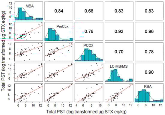 The previous analysis was repeated with the dataset excluding RBA, resulting in the comparative assessment of a larger total number of shellfish samples (n = 115). With approximately double the number of shellfish samples incorporated, differences were induced in the statistics of the method results compared to the previous dataset (Figure 5, Table S4). Table 3 summarises the mean PSP toxicity data obtained from each of the four methods. The scatter plots showed that the four methods were strongly correlated (Figure 6), which was confirmed with the high positive correlation coefficients. All of them were significant at the level of 5%.