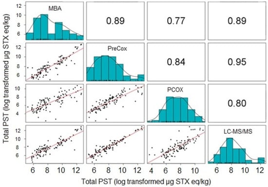 From the four LA regions studied here, statistical analysis demonstrated the MBA to correlate equally well with the RBA, PreCOX and LC-MS/MS methods, but with a lower correlation with PCOX (Figure 4). The correlation coefficient between MBA and PreCOX of 0.84 was higher than that reported previously in a multi-method assessment of PST concentrations in samples from Alaska [99] but similar to that from UK mussels [86]. Here, apparent differences in total PST following MBA in comparison with others were identified in certain species from some geographical regions, notably Chilean clams and mussels, Argentinean scallops and Uruguayan clams (Table 1 and Table 3). It is noted, however, that the MBA analyses were conducted several years prior to the other analyses, so there may be issues relating to either sample storage and/or transportation to other testing facilities. This does not explain, however, several instances of extreme outliers (defined here as results showing differences greater than an order of magnitude) for the MBA, specifically in three Argentinean mussels, one Argentinean scallop, two Chilean and one Uruguayan clam, all of which returned MBA results more than 10-fold higher than those determined using all other assays (Table S1).