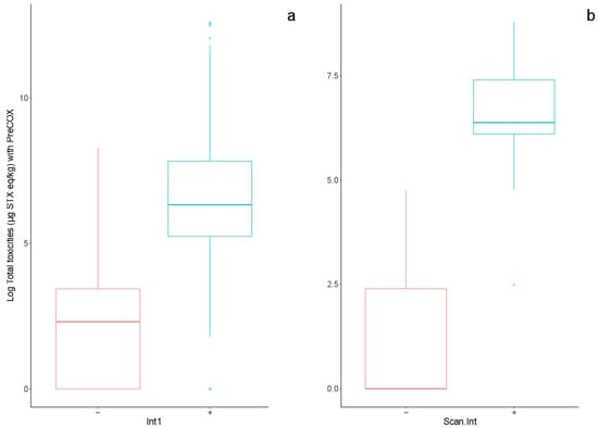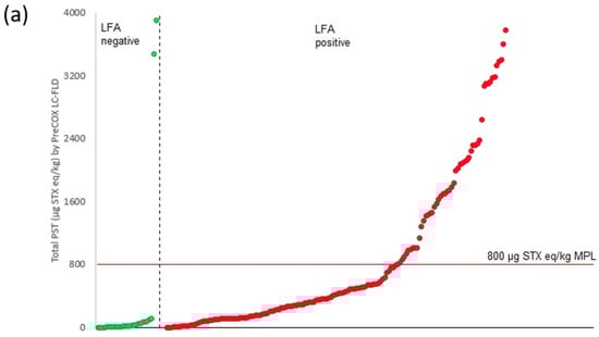 Previous work also illustrated a logarithmic correlation between LFA scan number and total PST concentrations determined by PreCOX LC-FLD, with scan numbers < 0.3 equating to toxicities above the MPL [98]. Such a relationship was also evident overall in this study (Figure 8b). However, three samples, two scallops and one mussel, with total PST higher than twice the MPL, returned scan values > 0.3, making use of the semi-quantitative aspect of the scanner more risky. Overall, therefore, use of the Scotia LFA would be useful for reducing the number of quantitative confirmatory analyses required, particularly as a product batch test, but a fully validated quantitative assessment using an appropriate method would still be required for regulatory testing, noting the risks resulting from a high proportion of false-positive and the potential for occasional false-negative LFA results in samples with significant toxin loads.