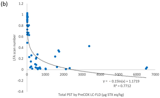 Scan numbers were produced for each of the automated scanner interpretation results from each of the LFA determinations. A regression was plotted between the scan numbers and PreCOX LC-FLD toxin concentrations, using 16 µg STX eq./kg for LC-FLD results showing no detectable toxins. Results showed the LFA scan numbers to decrease significantly with higher toxicity samples, with the regression showing a logarithmic correlation between the two parameters () with a correlation coefficient r2 = 0.7712 (Figure 8b).