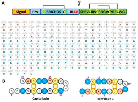 (A) Capitellacin precursor protein organization and amino acid sequence. The signal peptide sequence identified with SignalP-5.0 (http://www.cbs.dtu.dk/services/SignalP/) and the BRICHOS domain sequence identified with MyHits Motif Scan (https://myhits.isb-sib.ch/cgi-bin/motif_scan) are highlighted with brown and blue, respectively. The putative natural processing site is indicated with scissors. (B) Primary structure of capitellacin in comparison with that of tachyplesin-1.