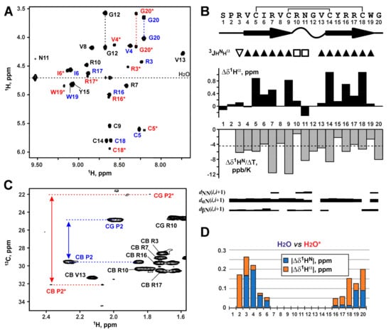 Analysis of the NMR spectra of capitellacin in water revealed the presence of two structural forms of the peptide (Figure 2A). The relative population of the two forms was about 1:5. Complete 1H and partial 13C resonance assignments of both peptide forms were obtained at pH 5.2 and 30 °C. A summary of the obtained NMR data is shown in Figure 2B. The 13Cβ resonances of Cys5, Cys9, Cys14, and Cys18 residues of the major form and 13Cβ resonances of Cys5 and Cys18 residues of the minor form were observed in the chemical shifts range from 47 to 49 ppm, which are characteristic for the oxidized Cys residues forming disulfide bonds. The chemical shifts of Cys9 and Cys14 residues in both forms were identical.