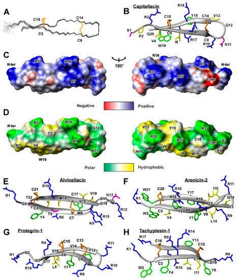 Spatial structure of capitellacin in comparison with other animal β-hairpin antimicrobial peptides. (A). The set of the best 20 capitellacin structures superimposed over the backbone atoms. Disulfide bonds are shown in orange. (B). The representative conformer of capitellacin in ribbon representation. The disulfide bonds, positively charged, hydrophobic, aromatic, and polar residues are colored in orange, blue, yellow, green, and magenta, respectively. (C,D) Two-sided view of molecular surface of capitellacin. Electrostatic (C) and molecular hydrophobicity (D) potentials are shown [13]. Red, blue, green, and yellow areas denote negative, positive, polar, and hydrophobic regions, respectively. Spatial structure of β-hairpin antimicrobial peptides alvinellacin (E), arenicin-2 (F), protegrin-1 (G), and tachyplesin-1 (H). PDB codes 7ALD, 2LLR, 2JNI, 1PG1, and 2RTV for capitellacin, alvinellacin, arenicin-2, protegrin-1, and tachyplesin-1, respectively.