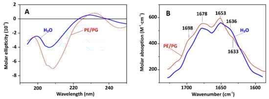 To characterize capitellacin interaction with lipid bilayers we used several technics: circular dichroism (CD), FTIR, and Trp fluorescence spectroscopy. In this study, PE/PG (2:1) lipids mimicking plasma membrane of E. coli were utilized. As presented in Figure 4A, the CD spectra of capitellacin dissolved in water showed a negative peak at 207 nm and a positive one at 230 nm. It is known that the backbone structure has a basic influence on the n→π٭ and π→π٭ rotational strengths. The negative CD band at ~210 nm is typical for β-turns [18]. The addition of PE/PG lipids resulted in a significant increase in the intensity that indicates the formation of more rigid structure in lipid bilayer (Figure 4A). The same spectrum overall shape with negative band at 205 nm and positive band at 230 nm was earlier shown for another structurally related β-hairpin AMP gomesin from the spider Acanthoscurria gomesiana [19]. Notably, the increase in the intensity was also observed in the presence of POPG or POPC lipids [19]. Gomesin is known as non-dimerizing 18-residue peptide with highly rigid structure stabilized with two disulfide bridges and the flexible Arg-Gly-Arg C-termini [20].