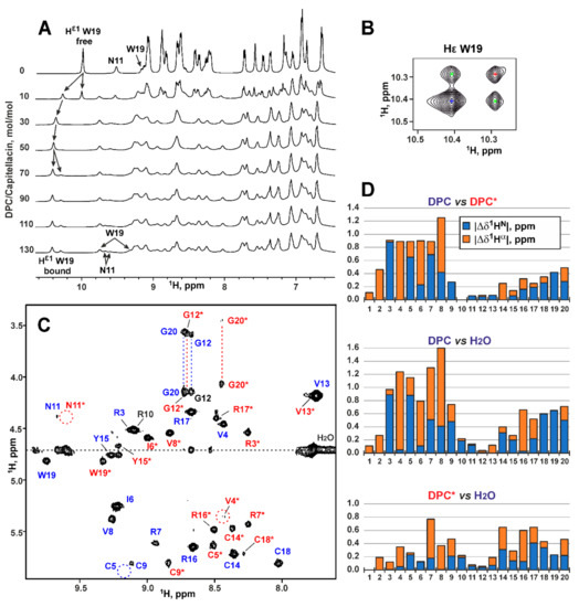 To confirm the absence of capitellacin dimerization in the membrane-mimicking environment we studied its structure by NMR spectroscopy in solution of dodecyl-phosphocholine (DPC) micelles. This environment was previously used for structural NMR studies of the arenicin-1 and arenicin-2 dimers [15,16,17]. Two sets of the capitellacin signals was observed upon addition of DPC to the capitellacin sample to the detergent-to-peptide molar ratio (D:P) of 10:1 (Figure 5A, two upper traces, Hε1 signal of Trp19). These sets corresponded to the peptide molecules being free in solution and bound to the micelles. Further increase in the DPC concentration to D:P of 30:1 led to disappearance of the free peptide signal, thus indicating complete micelle binding. At the same time, at D:P of 70:1 the second micelle-bound form of capitellacin became apparent in the spectra (Figure 5A). Further addition of DPC resulted in the narrowing of the signals of the second capitellacin form. To minimize an influence of this broadening, we used the D:P ratio of 130:1 for the structural study.