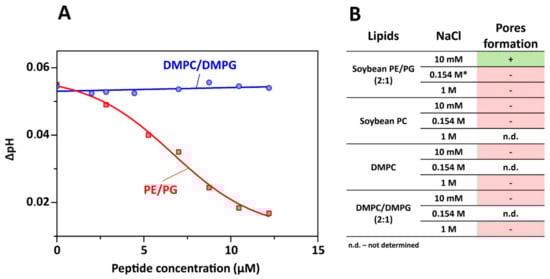 Sigmoidal concentration dependence of PTA (Figure 6A) revealed cooperativity in the pore formation by capitellacin. The inflection point of the graph indicates the pore-forming concentration of ~6 μM. Activity of capitellacin in membranes of various lipid composition and at different salt concentrations is shown in Figure 6B. Interestingly, the proton transfer was observed only in the PE/PG lipid system and only at low ionic strength (10 mM NaCl). This indicates that electrostatic interactions of the positively charged peptide (overall charge +5) with the negatively charged component (PG) of the membrane are essential for the pore formation. In contrast, our experiments carried out under identical conditions revealed the pore formation by 5 μM tachyplesin-1 in soybean PE/PG liposomes at much larger (close to physiological) NaCl concentration (154 mM). Thus, two conditions are necessary for PTA manifestation by capitellacin: (1) the presence of negatively charged lipid (PG) and low salt concentration; (2) the presence of PE—the lipid with a negative spontaneous curvature. Although the interactions of AMPs with PE-containing bilayers was discussed in detail earlier [25,26], the dependence of the β-hairpin peptide activity on phosphatidylethanolamine lipids was discovered for the first time.