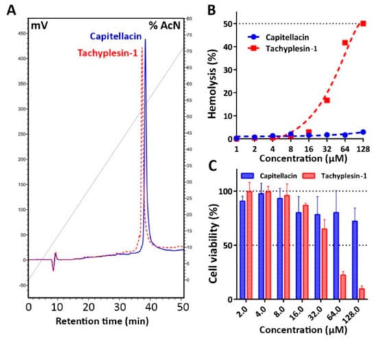 (A) Reversed-phase HPLC of recombinant capitellacin and tachyplesin-1 performed with a linear gradient of acetonitrile in water containing 0.1% TFA with the use of semi-preparative C18 column and detection at 214 nm. (B) Hemolytic activity of capitellacin and tachyplesin-1 after 1.5 h incubation (hemoglobin release assay). (C) Cytotoxicity of capitellacin and tachyplesin-1 against human embryonic fibroblasts (HEF) cell lines cells after 24 h incubation (3-(4,5-dimethylthiazol-2-yl)-2,5-diphenyltetrazolium bromide (MTT) dye reduction assay). The data are presented as the mean ± SD of at least three independent experiments.