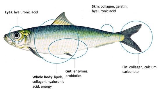 Fishery by-catch and processing by-products include different typologies of tissues and organs, including head, tails, skin, scales, bones, viscera that account for variable percentages of total fish body (Table 2).