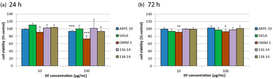 Cell viability of five different cell cultures was investigated, namely the human RPE (retinal pigment epithelium) cell line (ARPE-19), human, uveal melanoma cell line OMM-1, human fetal astrocytes SVGA and human glioblastoma cells 116-14 and 118-14. MTS-Assay (3-(4,5-Dimethylthiazol-2-yl)-5-(3-carboxymethoxyphenyl)-2-(4-sulfophenyl)-2H-tetrazolium) was performed after treatment with 10 or 100 µg/mL DF (Dictyosiphon foeniculaceus) extract for 24 (a) or 72 h (b). The mean values and standard deviation were calculated in relation to the untreated control (set to 100%, not shown). Significance tests were performed with One-Way ANOVA with multiple comparison test; * p < 0.05, ** p < 0.01, *** p < 0.001 compared to control group (n ≥ 4; number of independent experiments).