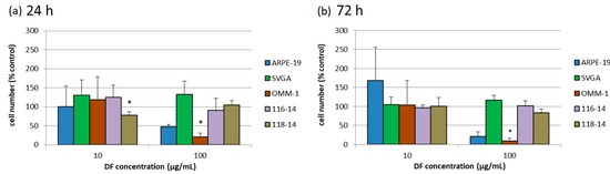 Cell proliferation of ARPE-19, SVGA, OMM-1, 116-14 and 118-14 was investigated by cell counting with trypan blue staining after treatment with 10 or 100 µg/mL DF extract for 24 (a) and 72 h (b), respectively. The mean values and standard deviation represent the mean of the cell number in relation to an untreated control in percent (set to 100%, not shown). Significance tests were performed with One-Way ANOVA with multiple comparison test; * p < 0.05, compared to untreated control group (n ≥ 4).