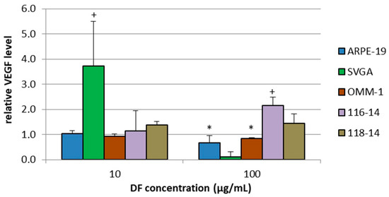 VEGF (vascular endothelial growth factor) secretion of ARPE-19, SVGA, OMM-1, 116-14 and 118-14 was assessed with ELISA (enzyme-linked immunosorbent assay) after treatment with 10 or 100 µg/mL DF extract for three days. The secreted individual VEGF amount in pg/mL was set in relation to the corresponding cell viability, which was determined in parallel. The mean values and standard deviation represent the mean of this calculated relative VEGF amount. Significance tests were performed with One-Way ANOVA with multiple comparison test; */+ p < 0.05, compared to untreated control group (n ≥ 4).