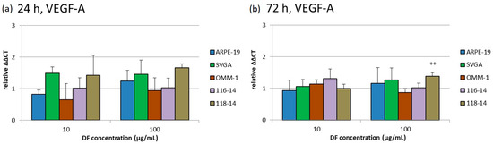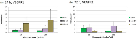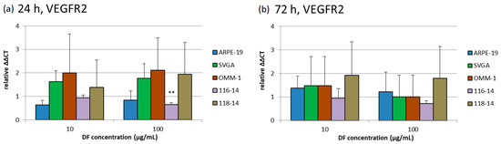 The effects of 10 and 100 µg/mL DF extract on the gene expression of VEGFR1, VEGFR2 and VEGF-A were determined with qPCR (quantitative polymerase chain reaction) after 24 and 72 h. The diagrams in Figure 4, Figure 5 and Figure 6 depict the potentiated ΔΔCT values, which are determined in relation to the corresponding untreated controls, respectively (control = 1). Expression of VEGFR1 could not be determined in ARPE-19 or OMM-1. In addition, the DF extract had no significant influence on the VEGFR1 expression of SVGA, 116-14 and 118-14.