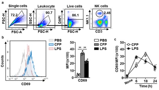 To evaluate the effects of CFP on the activation of splenic NK cells, C57BL/6 mice were injected intravenously (i.v.) with phosphate-buffered saline (PBS), 50 mg/kg CFP, or 0.1 mg/kg lipopolysaccharide (LPS). LPS was used as a positive control. Six, eighteen, and twenty-four hours after CFP injection, the spleen was harvested. Splenic NK cells were defined as CD3−NK1.1+ cells in live leukocytes (Figure 1a). The expression of CD69, which is a specific marker of lymphocyte activation, was found to be significantly increased in splenic NK cells upon CFP treatment (Figure 1b). CD69 expression observed in splenic NK cells upon CFP treatment was highest 18 h after injection, and rapidly reduced 24 h after treatment (Figure 1c). Therefore, these data indicate that CFP can upregulate CD69 expression in splenic NK cells in mice.