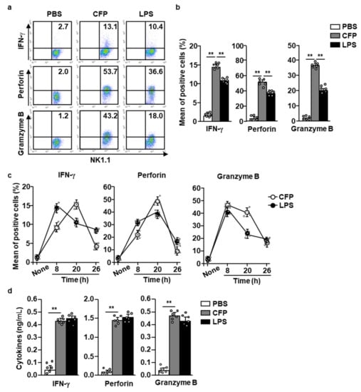CFP induced the secretion of interferon (IFN)-γ and cytotoxic mediators by NK cells. C57BL/6 mice were injected with PBS, 50 mg/kg CFP, or 0.1 mg/kg LPS (i.v.). Six, eighteen, and twenty-four hours after injection, splenocytes were isolated and then incubated with monensin for 2 h. (a) Intracellular levels of IFN-γ, perforin, and granzyme B were analyzed using flow cytometry. (b) Mean IFN-γ and cytotoxic mediator-producing NK cells. (c) Time-dependent patterns of IFN-γ and cytotoxic mediator-producing NK cells are shown. (d) Serum concentrations of IFN-γ, perforin, and granzyme B were measured using an enzyme-linked immunosorbent assay (ELISA). All data are representative or average values from six independent samples (two mice were used for each of the three experiments, n = 6, two-way ANOVA). ** p < 0.01.