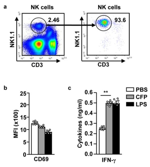 NK cells are activated by stimulators or cytokines produced by other immune cells. For evaluating the direct effects of CFP on NK cell activation, we isolated splenic NK cells and examined their activation upon CFP treatment. As shown in Figure 3a, splenic NK cells were isolated from splenocytes, and their proportion was found to be >90% of the splenocytes. Isolated NK cells were treated with PBS, 100 µg/mL CFP, or 10 µg/mL LPS for 18 h. CD69 was not upregulated upon CFP treatment (Figure 3b). However, the levels of IFN-γ in the culture medium were significantly increased upon CFP treatment (compared to those observed upon PBS treatment) (Figure 3c). Therefore, these data indicate that CFP directly promotes the secretion of IFN-γ by NK cells; however, the expression of CD69 was indirectly regulated by CFP.