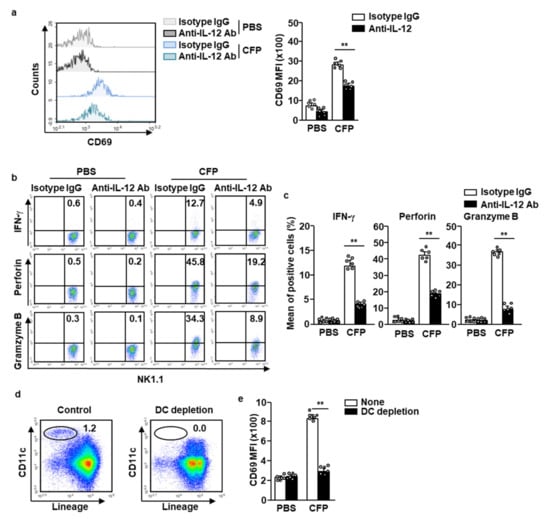 Because IL-12 is a main contributor to NK cell activation in vivo, we next accessed whether IL-12 is required for CFP-induced NK cell activation. Pretreatment with the anti-IL-12 antibody (Ab) partially inhibited the CFP-induced upregulation of CD69 in splenic NK cells (Figure 4a). Moreover, the intracellular levels of IFN-γ, perforin, and granzyme B were also dramatically decreased upon IL-12 blockade (compared to those observed upon CFP-only treatment) (Figure 4b,c). Since the CD69 expression in NK cells by CFP was partially dependent on IL-12, we next examined the contribution of DC in NK cell activation in the response to CFP. As shown in Figure 4d, the DC was depleted in splenocytes and the cells were further incubated with CFP for 18 h. The upregulated CD69 levels in NK cells by CFP were completely diminished by the depletion of DCs in the splenocytes (Figure 4e). Therefore, these data suggest that DC and IL-12 contribute to the CFP-induced activation of NK cells.