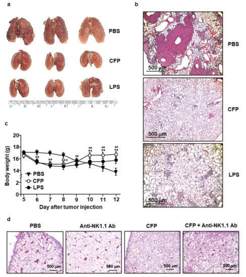 CFP inhibited tumor cell infiltration in lung tissues. BALB/c mice were injected i.v. with 0.3 × 106 CT-26 cells. Five days after the administration of tumor cells, mice were treated intraperitoneally (i.p.) with PBS, 50 mg/kg CFP, or 0.1 mg/kg LPS (every day). (a) Lung tissues on day 12 after tumor injection. (b) Infiltration of CT-26 cells into lung tissues analyzed using H&E staining. (c) Changes in body weight measured during treatment with CFP and LPS, respectively. **, p < 0.01 (PBS vs. CFP), and ##, p < 0.01 (CFP vs. LPS). (d) C57BL/6 mice were injected i.v. with 0.5 × 106 B16 cells. Four days after tumor cell injection, 50 µg of anti-NK1.1 Ab was injected at a two day interval. From the 5th day of tumor injection, the mice were treated i.p. with PBS and 50 mg/kg of CFP. On day 12 of tumor injection, the lung was harvested and the sections were stained with H&E. All data are representative or average values of six independent samples (two mice were used for each of the three experiments, n = 6, two-way ANOVA).